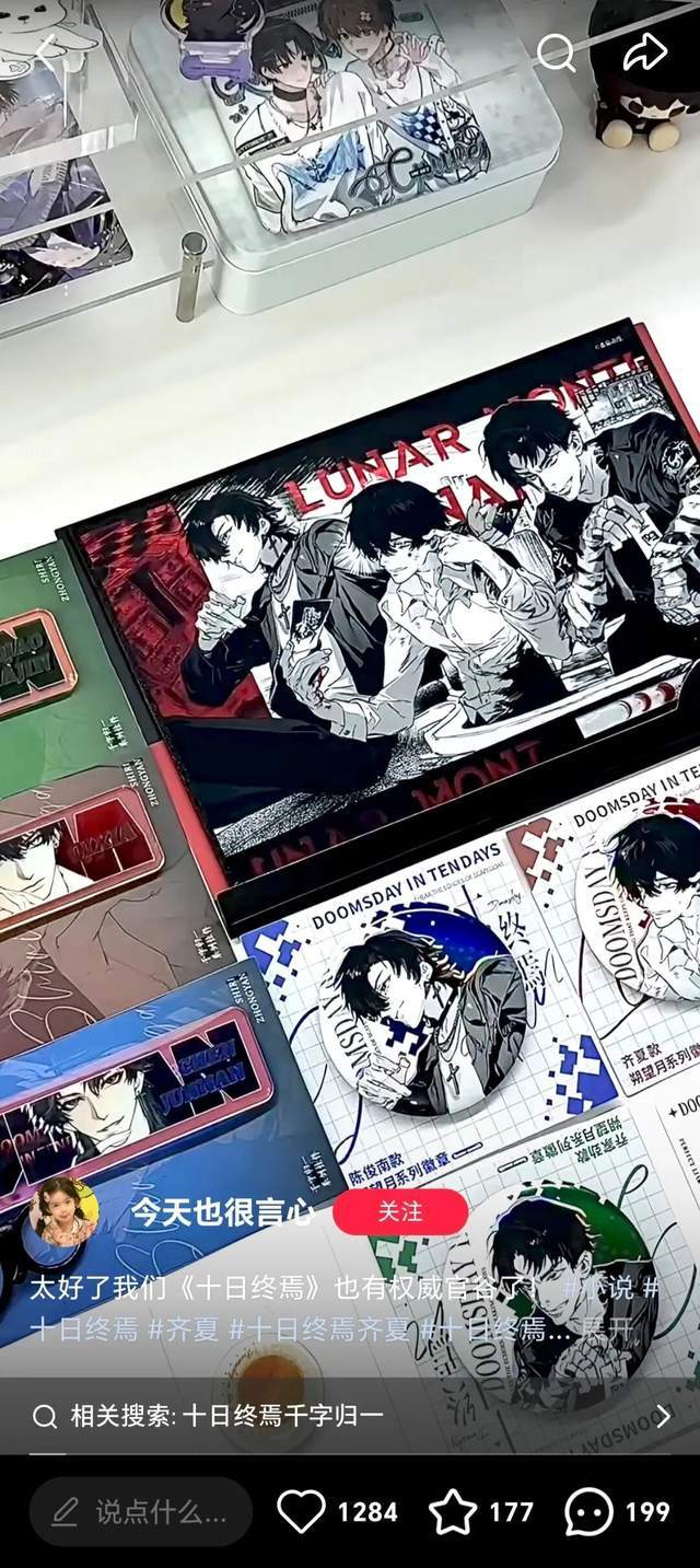“暑假《十日终焉》的谷真的吃到饱!从线上到线下,应买尽买了!”上海的小夏告诉剁椒Spicy,作为《十日终焉》男主齐夏的粉丝,小夏几乎集齐了所有官方周边,她甚至收藏了角色官周图鉴一一对照寻找,还会为了获得一些古早款而蹲守在小说超话。